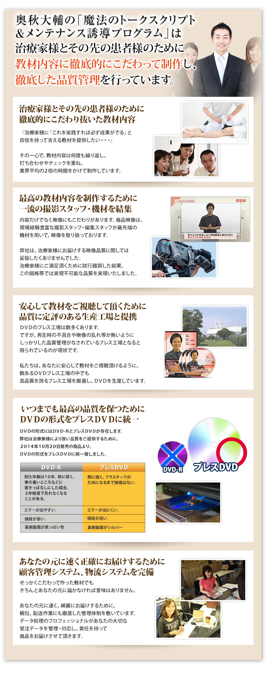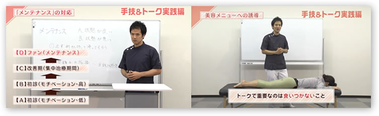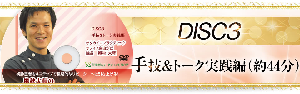 奥秋先生のDVDでは、今までの手技を変えることなく、お客様との信頼関係を築きながら、しかも誰でも実践できるノウハウが凝縮されています。シンプルですが奥の深い体系立った構成になっています。