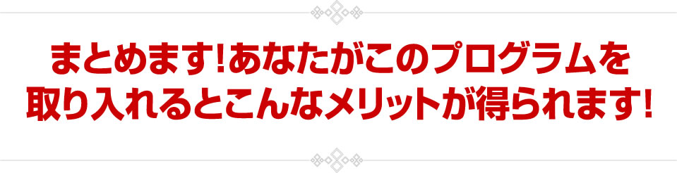 これは単発的にお金が稼げると言った類のものではなく、あなたが治療家として新たにスタートし、長期的に売上げを向上していくプログラムです。これさえあればあなたも繁盛治療家に二歩も三歩も近づくことができます。これまであなたが投資してきた費用はすぐに回収できると言っても過言ではありません。