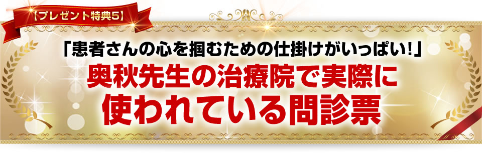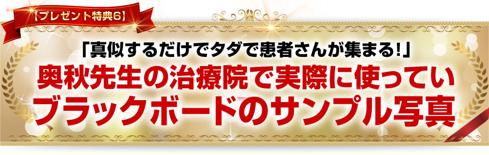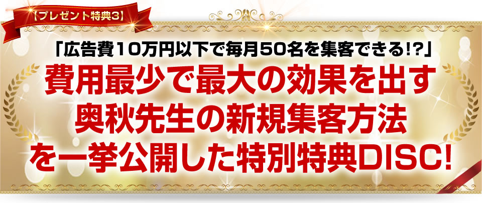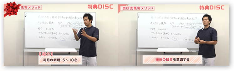 この特典Discでは、安定経営を実現するために奥秋先生が試行錯誤されてきた集客法を一挙公開しております。是非、あなたの院にも取り入れてみてください。