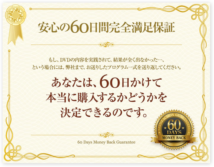 もし、DVDを購入して頂き、今よりも技術的なスキルが上がらない、或は実践したにも関わらず効果がみられないということであれば、 弊社商品配送日から60日以内(必着)であれば、全額返金します。