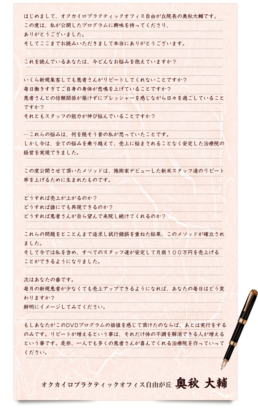 このトークスクリプトは、奥秋先生が実際にスタッフ教育に使っているものを、今回のDVDプログラムのためだけに特別に加筆・修正を行い新しく作成したものです。