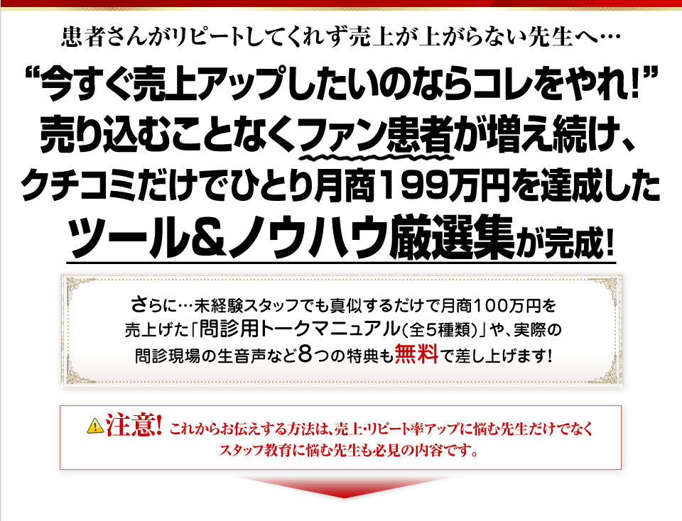 何度も何度もDVDを見返すことができて、集客コスト0円でも最高月商199万円を売上げ、スタッフにもコンスタントに月商100万円を稼がせる繁盛治療家のノウハウをご自身に落とし込めるのならば、お金には換算できない価値があります。